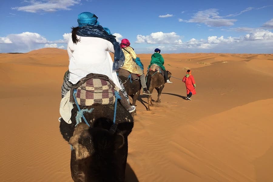 Beginning with a stop at a nomadic family reliant on their herd of cattle and living in a woollen tent, we’ll go on to a small hamlet where we’ll take in some Gnawa music and unique dances. We’ll have a Berber desert pizza at a nearby restaurant for lunch. We will take the camels in the afternoon from a designated location through the dunes to our tent on the other side. After taking sunset photos, we will continue to our destination where we will spend the whole evening with the local Berber people enjoying supper, music, and perhaps dancing.